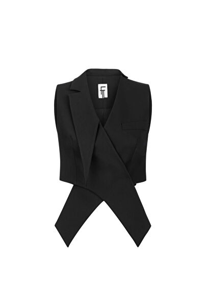 Snowy Black Asymmetrical Fabric Detailed Women's Crop Vest