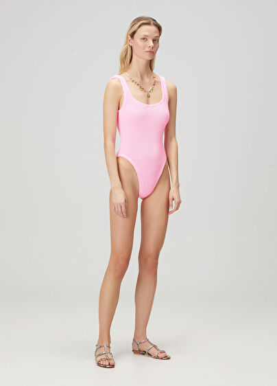 Square neck, open back, textured swimwear