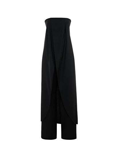 Strapless jumpsuit with cape effect designed from 100% wool fabric