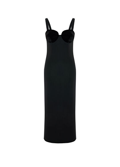 Soirée Black Wool Silk Velvet Detailed Strappy Women's Long Dress