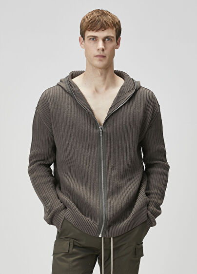 Hooded, zipper closured, line textured, wool knit cardigan