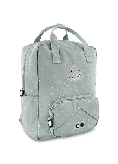On the outside, you'll find a zippered front pocket, pockets for water bottles and snacks on both sides, reflective details for safety, and top handles for easy carrying
