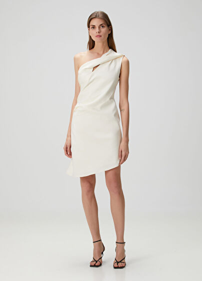 Düğüm detaylı, tek omuzlu, gizli fermuar kapatmalı mini elbise