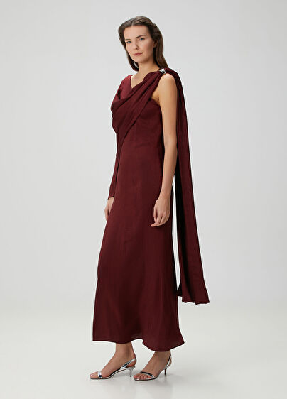 Asimetrik yaka, drape detaylı, maksi boy elbise