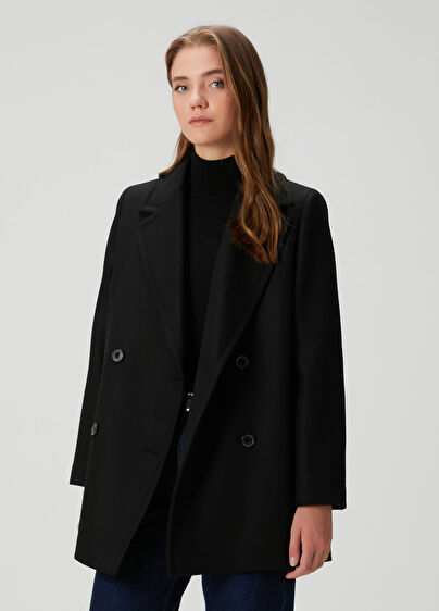 Kelebek yaka, düğme kapatmalı, kruvaze kaşe kaban