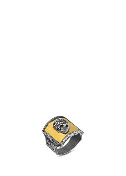 24 ayar altın ve 925 ayar gümüş, el oyması kalem işçilikli kurukafa yüzük