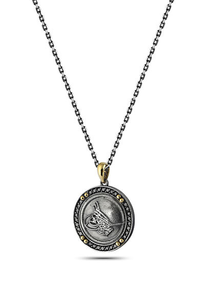 14 ayar altın ve 925 ayar gümüş, siyah pırlanta, tuğra kolye