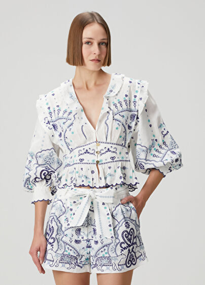 V yaka, nakışlı, keten gömlek