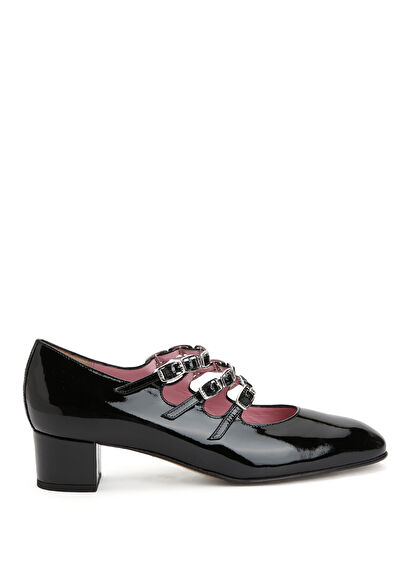 Yuvarlak burun, kemer detaylı, deri topuklu ayakkabı