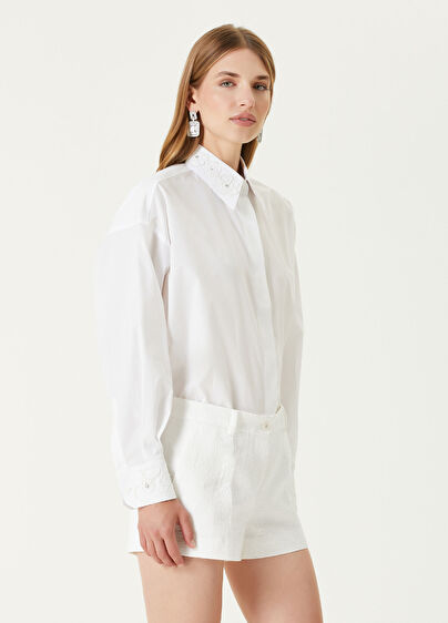 Yakası işlemeli, gizli düğme kapatmalı gömlek
