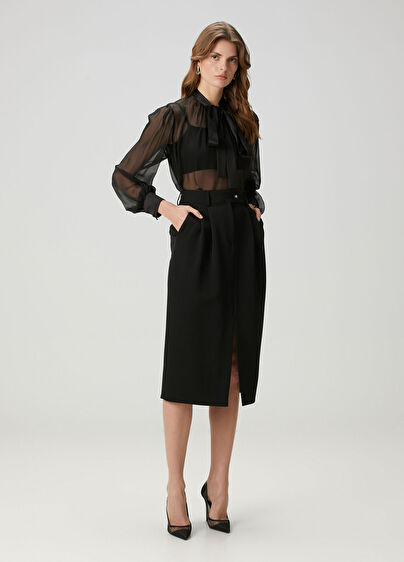 Fermuar kapatmalı, yırtmaçlı, midi etek