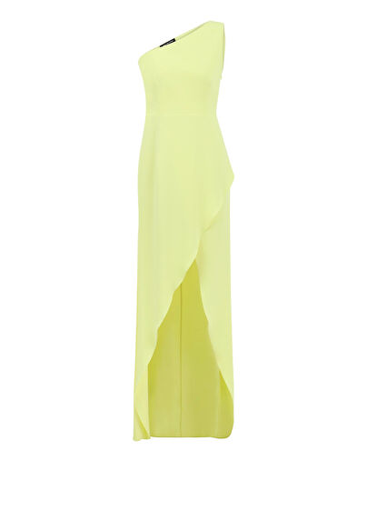 Tek omuz detaylı, önden yırtmaçlı, çift katmanlı ve yandan fermuarlı maxi elbise