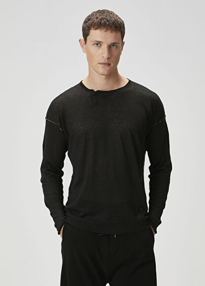 Yakası düğme detaylı, kontrast dikişli, keten triko