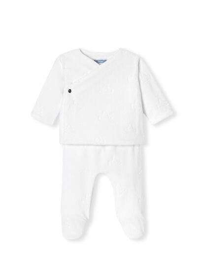 Martı motifli set, çapraz açıklığı olan, tamamen jarse astarlı, sıcak ve rahat bir hırka ve rahat, vücudu saran, nervürlü lastikli bel bandına sahip bir pantolondan oluşuyor