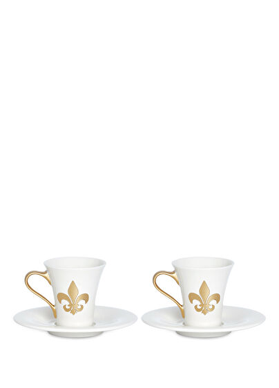 Altın kumlama tekniği ile Fleur De Lis sembolünün elde özenle işlendiği bu fincan, kahve ritüelinize huzur ve neşe katmak için tasarlanmıştır