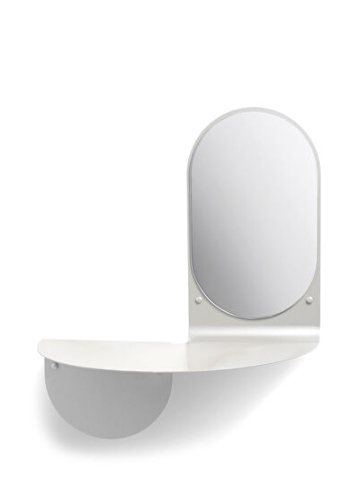 Toz boya ile kaplanmış sac metalden üretilen bu ayna, yalnızca bir ayna değil, aynı zamanda pratik bir raf olarak da işlev görür