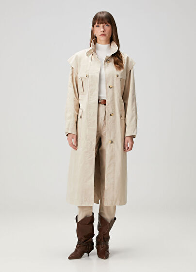 Dik yaka, düğme kapatmalı, düz renk pardösü
