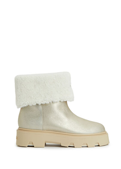 Yuvarlak burun, logo detaylı, parlak dokulu, deri bot