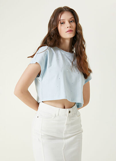 Bisiklet yaka, kısa kol, crop taş detaylı t-shirt