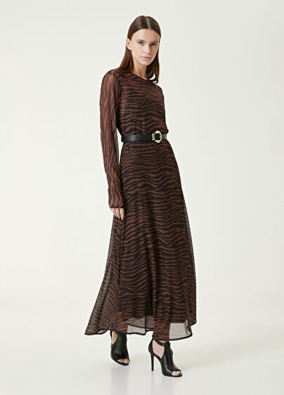 Bisiklet yaka, uzun kol, desenli, maxi tül elbise