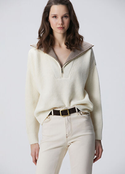 Fermuarlı yaka, uzun kol, yün triko kazak
