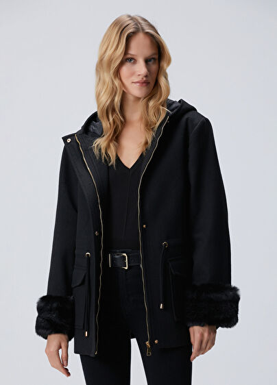 Kendinden kapüşonlu, beli büzgülü, kol ucu kürklü manto