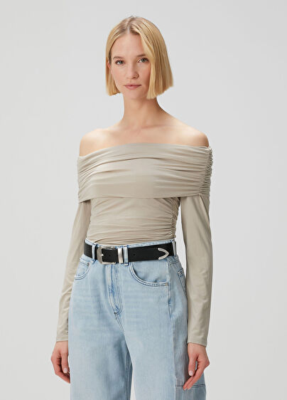 Düşük omuzlu, drape detaylı, uzun kollu bluz