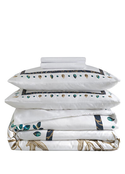 1 nevresim (200x220cm), 1 çarşaf (240x260cm) ve 2 yastık kılıfı (50x70cm) içerir