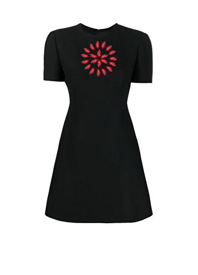 Flow Siyah Krep Taşlı Kısa Kollu Kadın Elbise