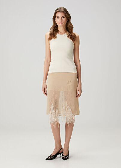 Halter yaka, eteği işlemeli, tüy detaylı, midi boy elbise