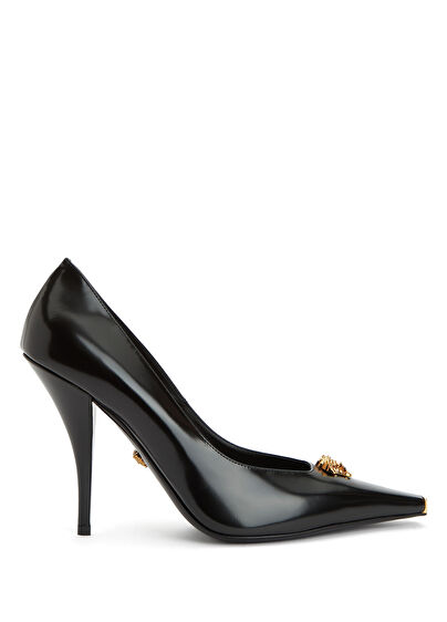 Sivri burun, logo tokalı, deri stiletto