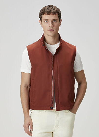 Dik yaka, fermuar kapatmalı, keten yelek