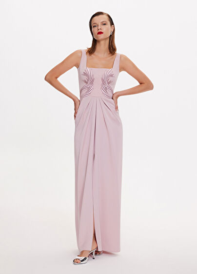 Pembe Kare Yaka Nakış Detaylı Kadın Abiye Elbise